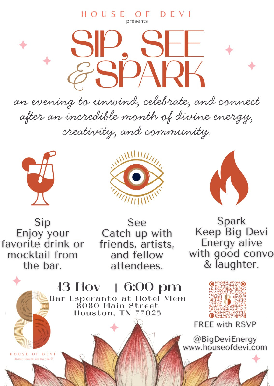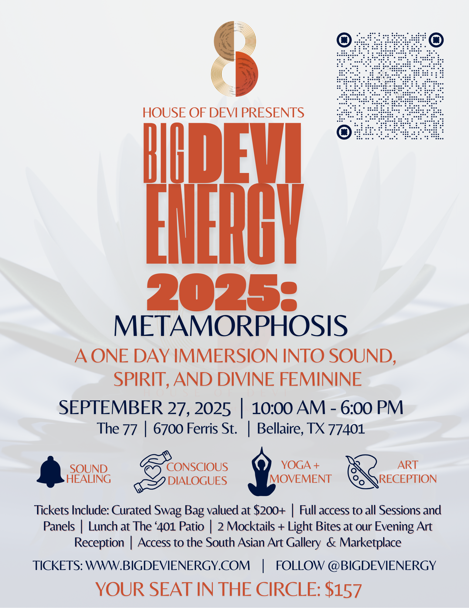 As the Big Devi Energy Conference comes to a close, we invite you to linger, connect, and celebrate at our Mocktail Party & Art Showcase in the House of Devi Art Gallery. From 5-7 PM, enjoy an evening of art, conversation, and creativity, surrounded by the stunning works of our featured artists.