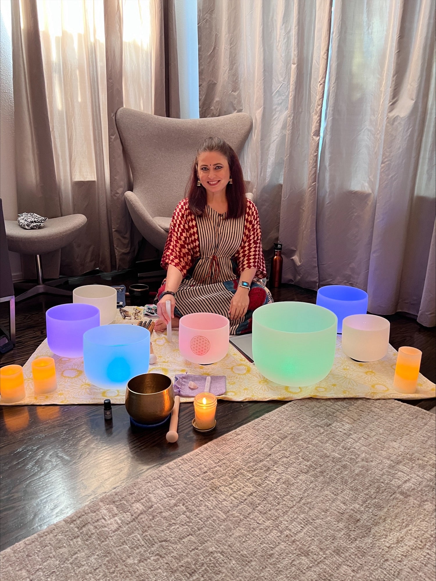 Anita Vyas is the founder of Antar Glow, a mobile sanctuary offering crystal bowl sound baths, women’s circles, and Dance Into Stillness—a 90-minute journey blending Bollywood dance fitness with sound healing. With 15+ years in higher education and a background in instructional design, she bridges science and soul to create safe, transformative spaces. With over a decade as a Bollywood dancer and choreographer at Naach Houston, Anita brings joy, embodiment, and cultural celebration into every gathering. Rooted in her Indian heritage and grounded in Texas, Anita believes healing can be both sacred and playful—inviting all to tune in, slow down, and glow from within.